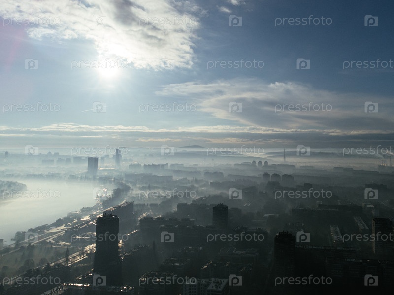 Вид из воздуха с беспилотного летательного аппарата города Белграда в смоге и тумане утром.Жемунский район и Новый Бельград, Сербия, Европа
