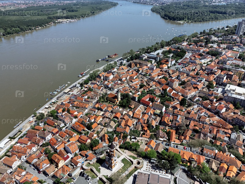 Панорамный вид с беспилотника на башню Гардоса, церковь Святого Николая, Земун, Белград, Сербия