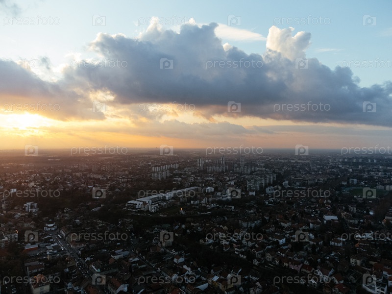 Полет беспилотника на закате над районом Земум, Белград, Сербия, Европа