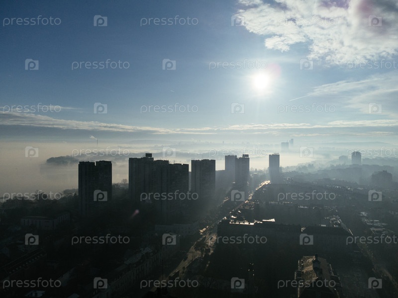 Вид из воздуха с беспилотного летательного аппарата города Белграда в смоге и тумане утром.Жемунский район и Новый Бельград, Сербия, Европа