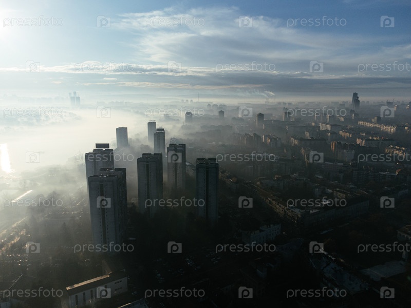 Вид из воздуха с беспилотного летательного аппарата города Белграда в смоге и тумане утром.Жемунский район и Новый Бельград, Сербия, Европа