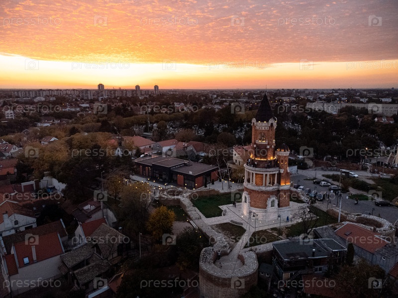 Вид с воздуха на город Земун и башню Гардош при закате солнца, крыши домов и речная панорама