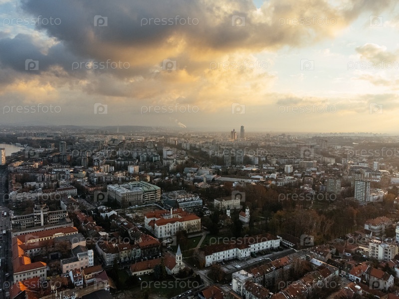 Полет беспилотника на закате над районом Земум, Белград, Сербия, Европа