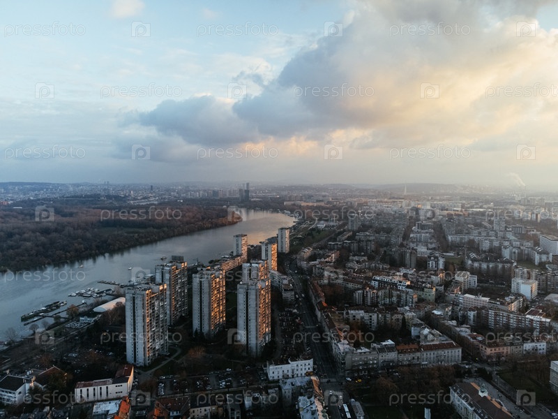 Полет беспилотника на закате над районом Земум, Белград, Сербия, Европа