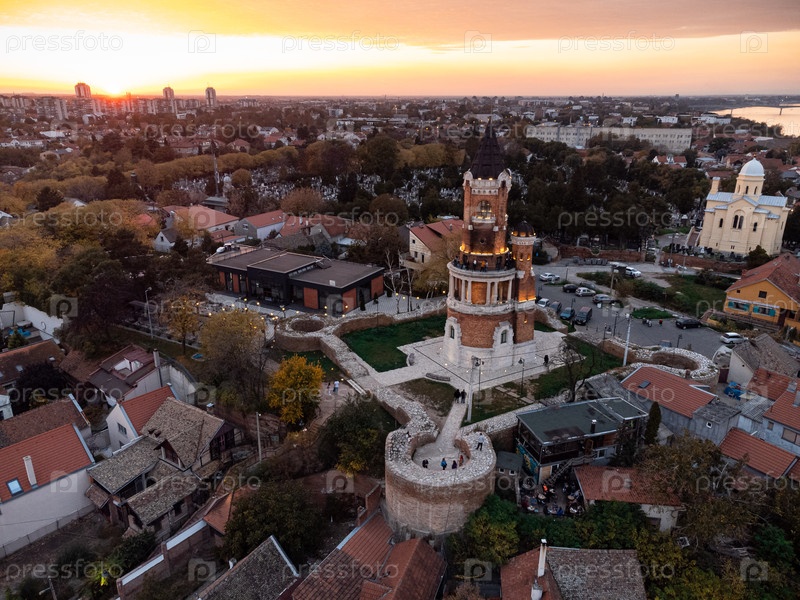 Вид с воздуха на город Земун и башню Гардош при закате солнца, крыши домов и речная панорама
