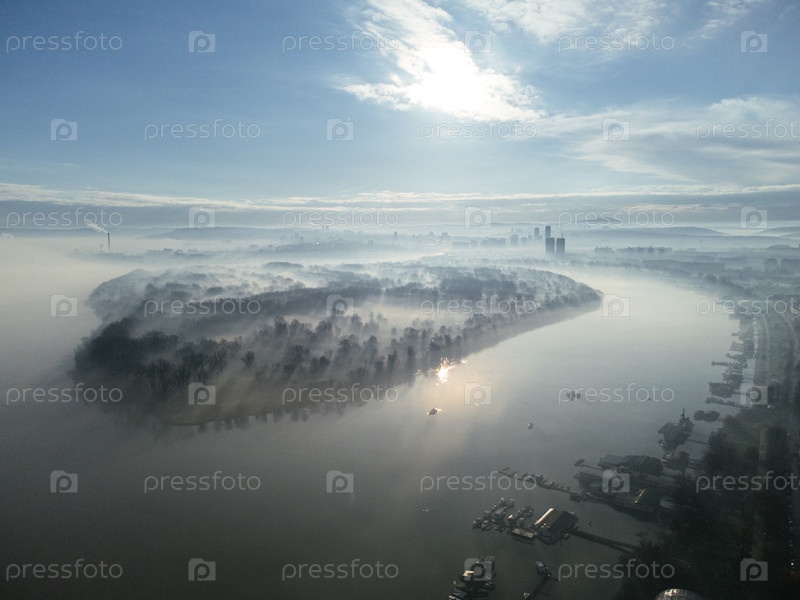 Полет беспилотника над рекой Дунай в смоге и тумане утром.Дистрикт Земун и Новый Белград, Белград, Сербия, Европа