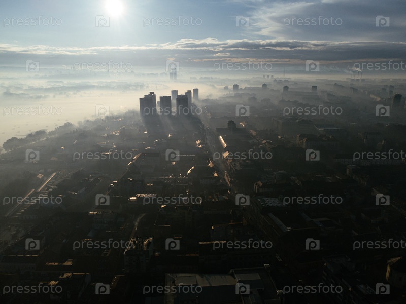 Вид из воздуха с беспилотного летательного аппарата города Белграда в смоге и тумане утром.Жемунский район и Новый Бельград, Сербия, Европа