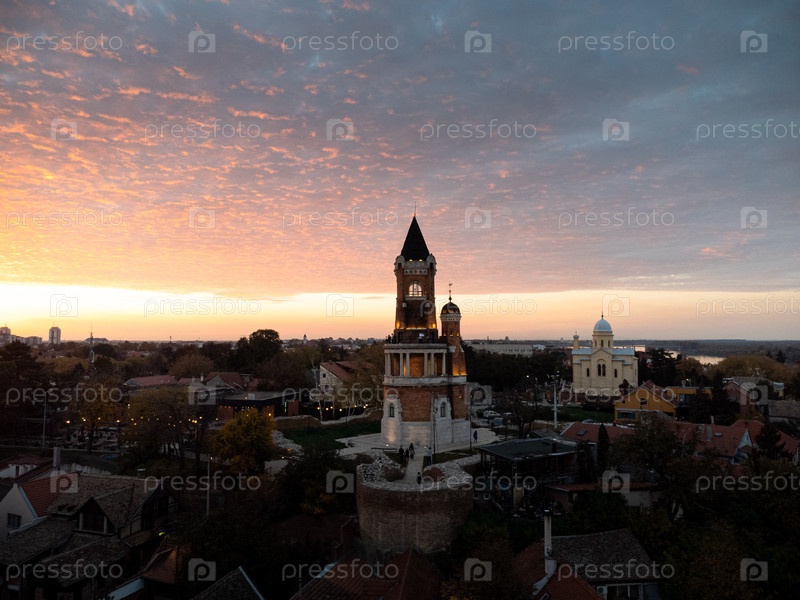 Вид с воздуха на город Земун и башню Гардош при закате солнца, крыши домов и речная панорама