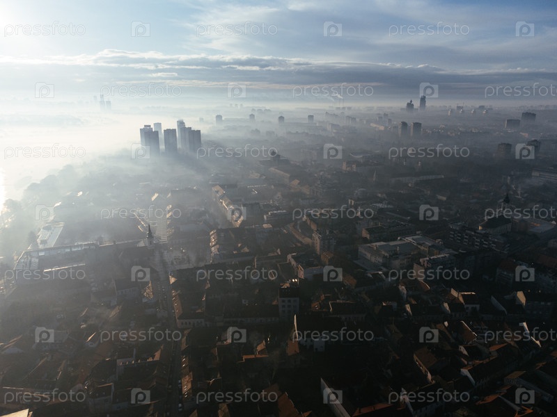 Вид из воздуха с беспилотного летательного аппарата города Белграда в смоге и тумане утром.Жемунский район и Новый Бельград, Сербия, Европа
