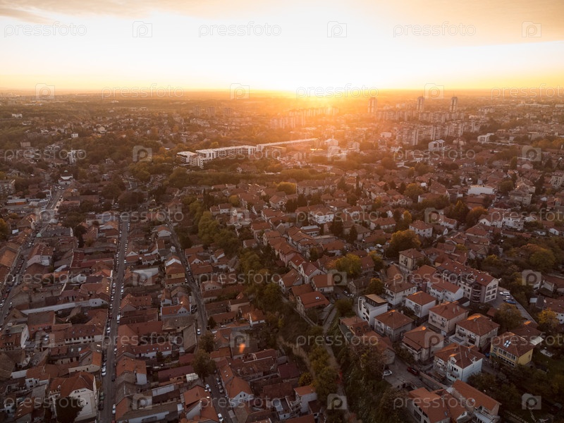 Вид с беспилотника на закат над районом Земум, Белград, Сербия, Европа. 4K