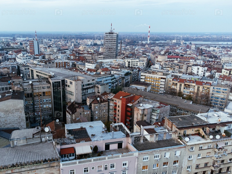 Вид беспилотника на исторический центр Белграда при закате