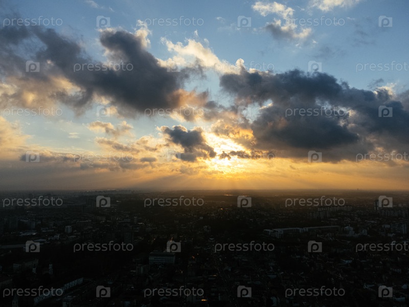 Полет беспилотника на закате над районом Земум, Белград, Сербия, Европа