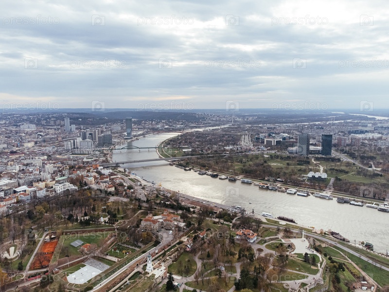Вид с беспилотника: вид на город Белград сверху старой крепости Калемегдан, Сербия