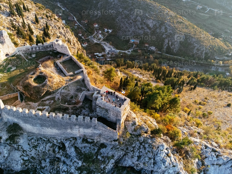 Вид с воздуха Любушкинской крепости на скалистом холме при закате солнца, окруженный крутыми горами и лесистой долиной