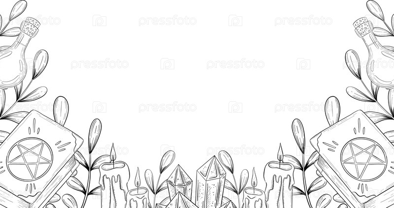 Сборник иллюстраций Mystical Magic Engraving Illustrations Set.Ручно нарисованные эскизы татуировочного стиля из кристаллического шара, кристаллов, зеленых напитков, карт, трав и свечей.Тема магии, тайны и колдовства