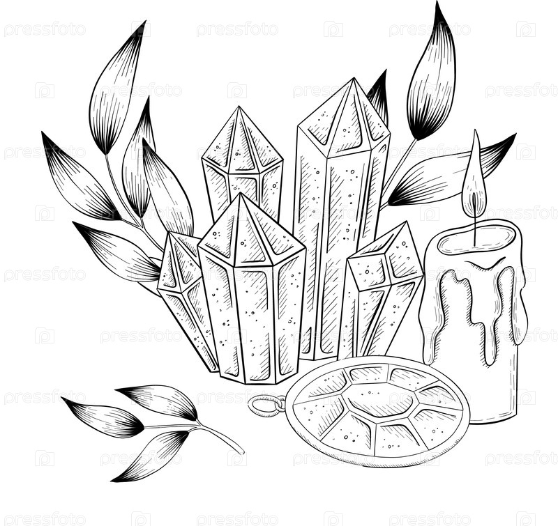 Сборник иллюстраций Mystical Magic Engraving Illustrations Set.Ручно нарисованные эскизы татуировочного стиля из кристаллического шара, кристаллов, зеленых напитков, карт, трав и свечей.Тема магии, тайны и колдовства