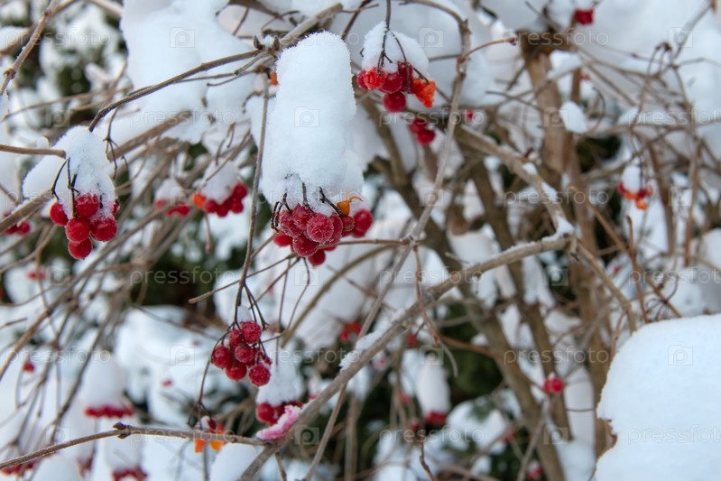 Ягоды на ветке калины зимним днем после снегопада