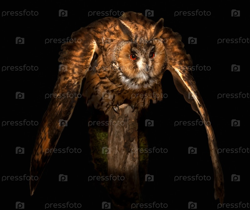 Ушастая сова в момент взлета на черном фоне