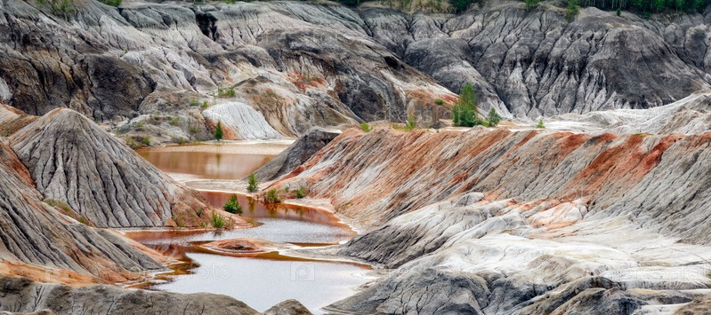 Уральский Марс. необычайно красивый летний пейзаж с красными озерами, цветными склонами и лесом. живописный горный массив. природные ландшафты, впечатляющее небо. природа Урала