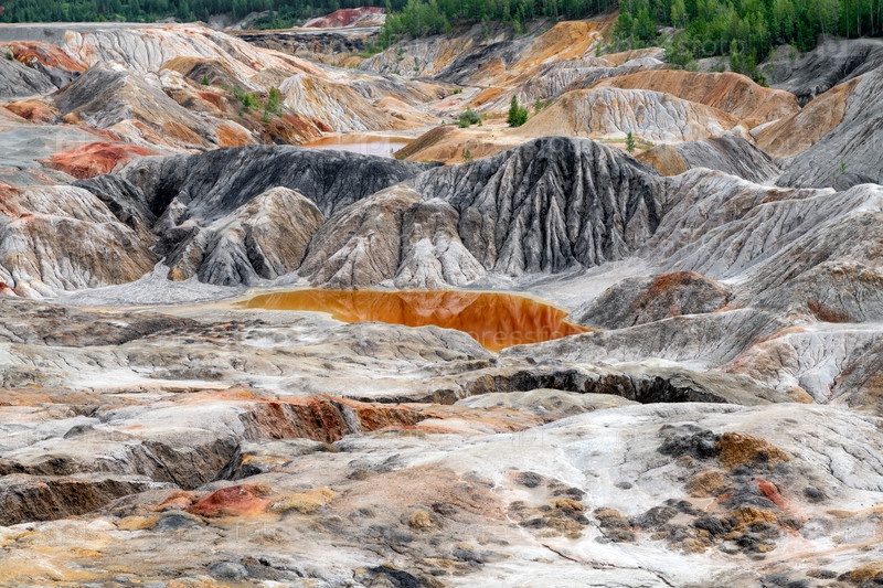 Уральский Марс. необычайно красивый летний пейзаж с красными озерами, цветными склонами и лесом. живописный горный массив. природные ландшафты, впечатляющее небо. природа Урала