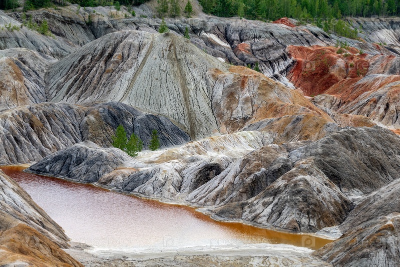 Уральский Марс. необычайно красивый летний пейзаж с красными озерами, цветными склонами и лесом. живописный горный массив. природные ландшафты, впечатляющее небо. природа Урала