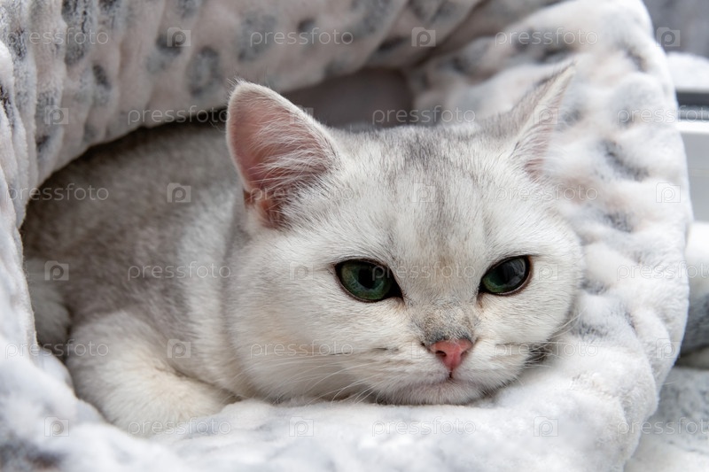 Кошка породы Британская кошка шиншилла в одеяле грустно смотрит на зрителя