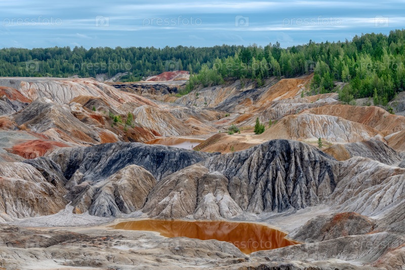 Уральский Марс. необычайно красивый летний пейзаж с красными озерами, цветными склонами и лесом. живописный горный массив. природные ландшафты, впечатляющее небо. природа Урала