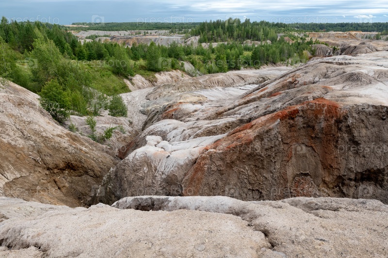 Уральский Марс. необычайно красивый летний пейзаж с красными озерами, цветными склонами и лесом. живописный горный массив. природные ландшафты, впечатляющее небо. природа Урала
