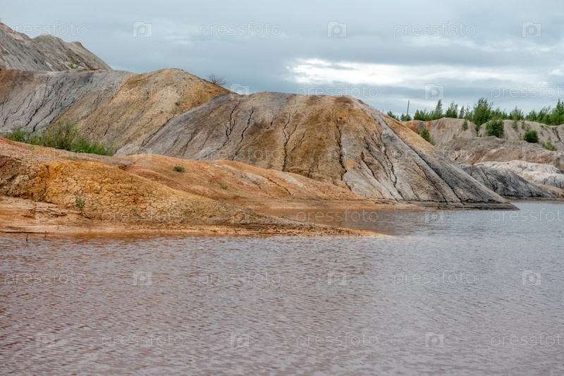 Уральский Марс. необычайно красивый летний пейзаж с красными озерами, цветными склонами и лесом. живописный горный массив. природные ландшафты, впечатляющее небо. природа Урала