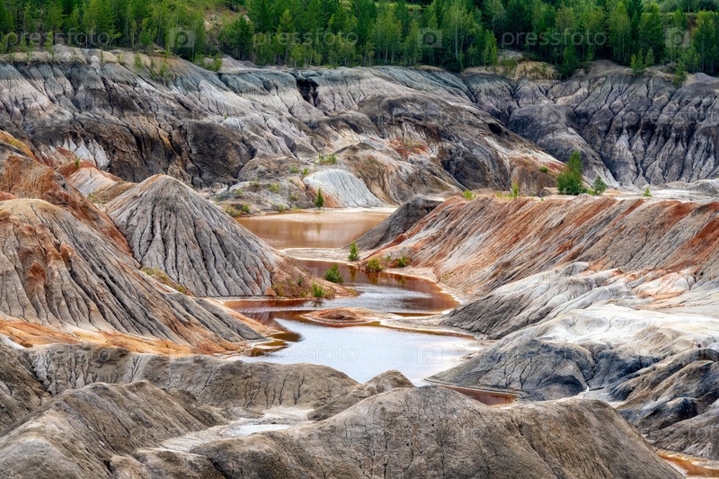 Уральский Марс. необычайно красивый летний пейзаж с красными озерами, цветными склонами и лесом. живописный горный массив. природные ландшафты, впечатляющее небо. природа Урала