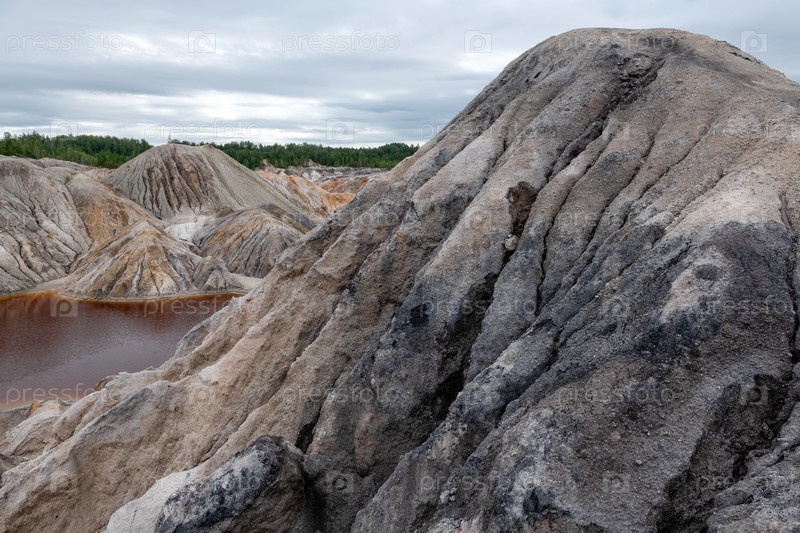 Уральский Марс. необычайно красивый летний пейзаж с красными озерами, цветными склонами и лесом. живописный горный массив. природные ландшафты, впечатляющее небо. природа Урала