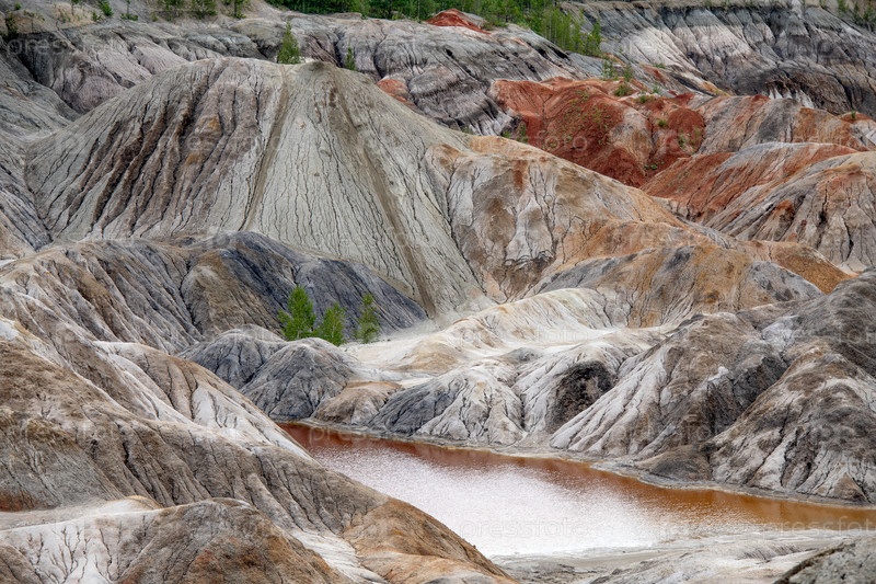 Уральский Марс. необычайно красивый летний пейзаж с красными озерами, цветными склонами и лесом. живописный горный массив. природные ландшафты, впечатляющее небо. природа Урала