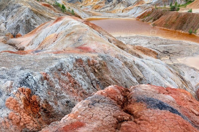 Уральский Марс. необычайно красивый летний пейзаж с красными озерами, цветными склонами и лесом. живописный горный массив. природные ландшафты, впечатляющее небо. природа Урала