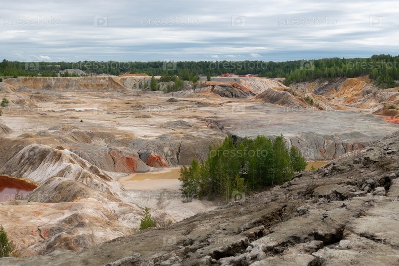 Уральский Марс. необычайно красивый летний пейзаж с красными озерами, цветными склонами и лесом. живописный горный массив. природные ландшафты, впечатляющее небо. природа Урала