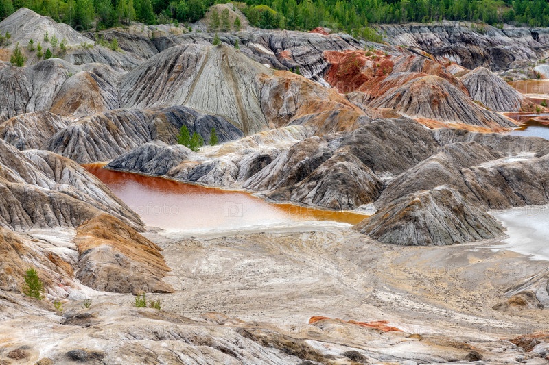 Уральский Марс. необычайно красивый летний пейзаж с красными озерами, цветными склонами и лесом. живописный горный массив. природные ландшафты, впечатляющее небо. природа Урала