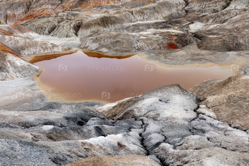 Уральский Марс. необычайно красивый летний пейзаж с красными озерами, цветными склонами и лесом. живописный горный массив. природные ландшафты, впечатляющее небо. природа Урала