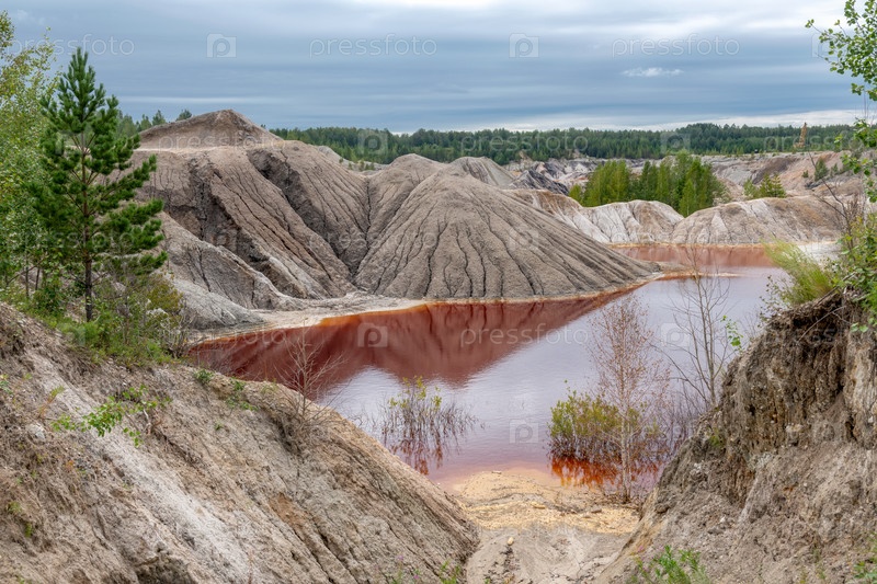 Уральский Марс. необычайно красивый летний пейзаж с красными озерами, цветными склонами и лесом. живописный горный массив. природные ландшафты, впечатляющее небо. природа Урала