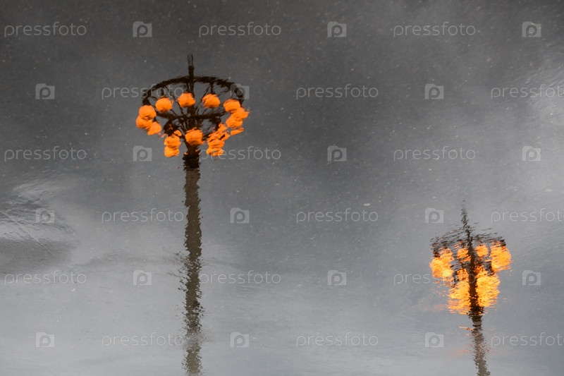 Фонари на центральной аллее Выставки достижений народного хозяйства (ВДНХ) отражаются в лужах дождливым весенним днем