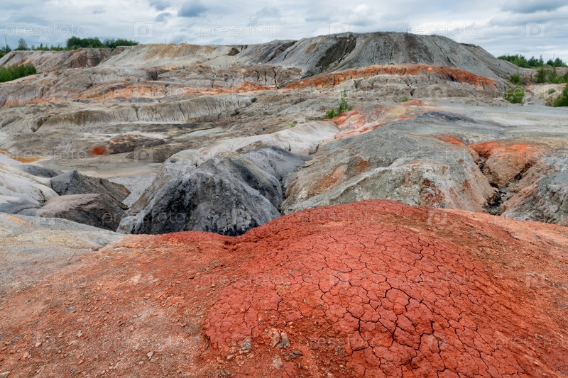 Уральский Марс. необычайно красивый летний пейзаж с красными озерами, цветными склонами и лесом. живописный горный массив. природные ландшафты, впечатляющее небо. природа Урала