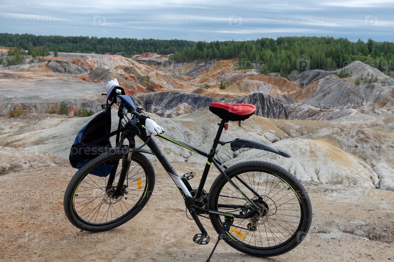 Велосипед на фоне Уральского Марса. Чрезвычайно красивый летний пейзаж с красными озерами, красочными склонами и лесом. Живописный горный массив. Естественный ландшафт, зрелищное небо. Природа Урала