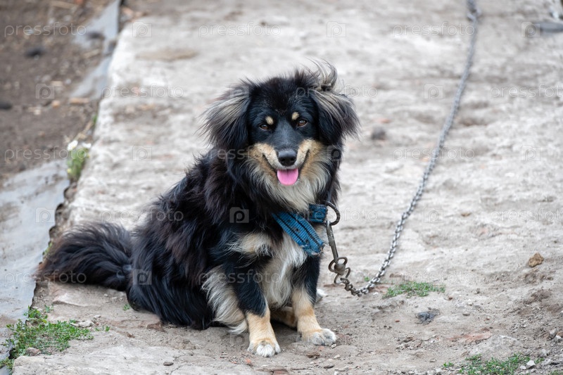 Осторожно злая собака. Маленькая беспородная собака на цепи охраняет двор в деревне