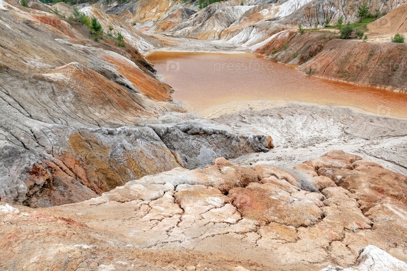 Уральский Марс. необычайно красивый летний пейзаж с красными озерами, цветными склонами и лесом. живописный горный массив. природные ландшафты, впечатляющее небо. природа Урала