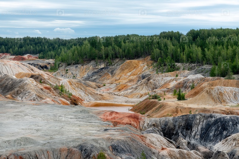 Уральский Марс. необычайно красивый летний пейзаж с красными озерами, цветными склонами и лесом. живописный горный массив. природные ландшафты, впечатляющее небо. природа Урала