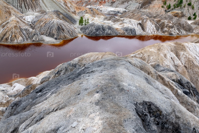 Уральский Марс. необычайно красивый летний пейзаж с красными озерами, цветными склонами и лесом. живописный горный массив. природные ландшафты, впечатляющее небо. природа Урала