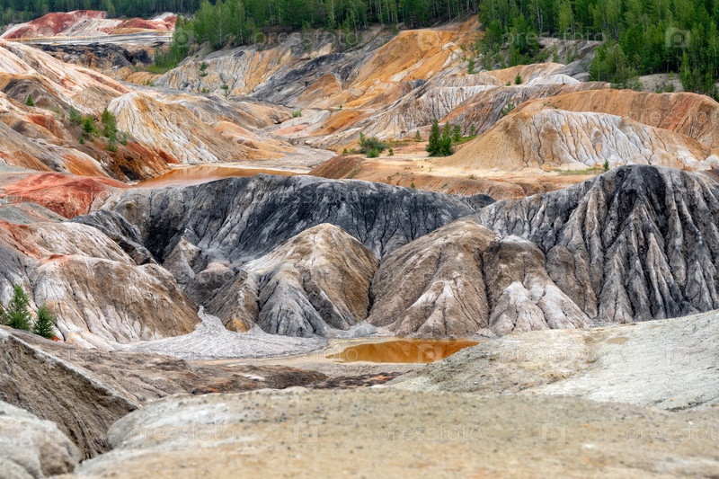 Уральский Марс. необычайно красивый летний пейзаж с красными озерами, цветными склонами и лесом. живописный горный массив. природные ландшафты, впечатляющее небо. природа Урала