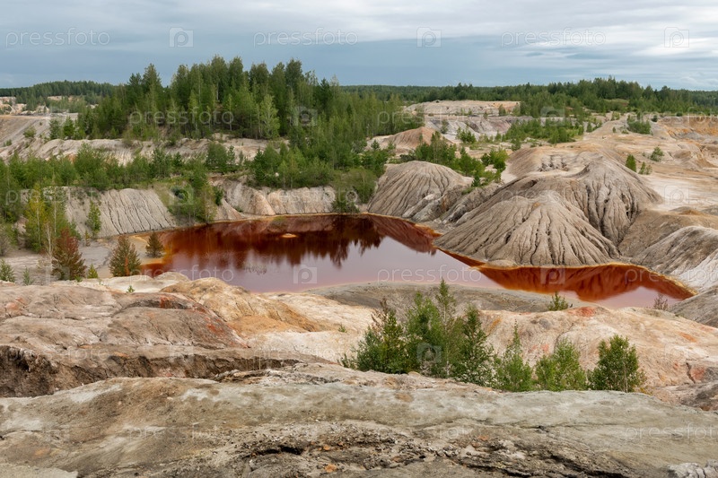 Уральский Марс. необычайно красивый летний пейзаж с красными озерами, цветными склонами и лесом. живописный горный массив. природные ландшафты, впечатляющее небо. природа Урала