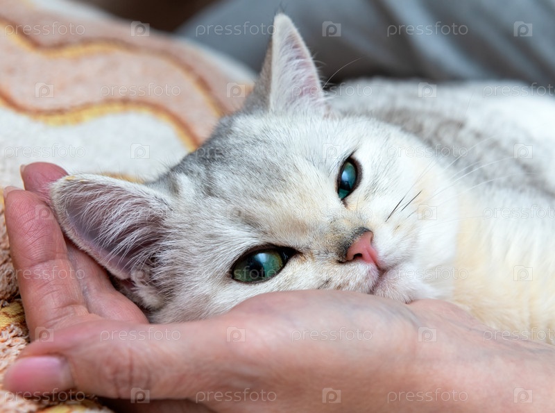 Молодая светлая кошка породы британская шиншилла отдыхает лежа на женской руке