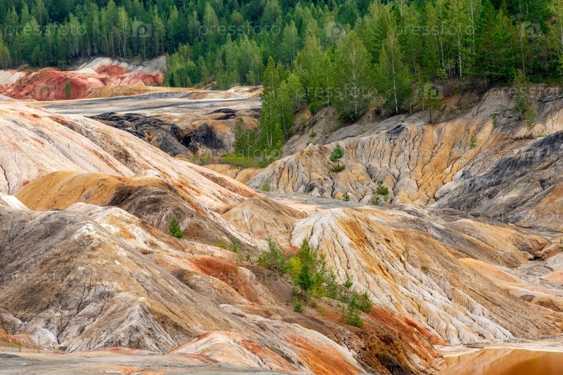 Уральский Марс. необычайно красивый летний пейзаж с красными озерами, цветными склонами и лесом. живописный горный массив. природные ландшафты, впечатляющее небо. природа Урала