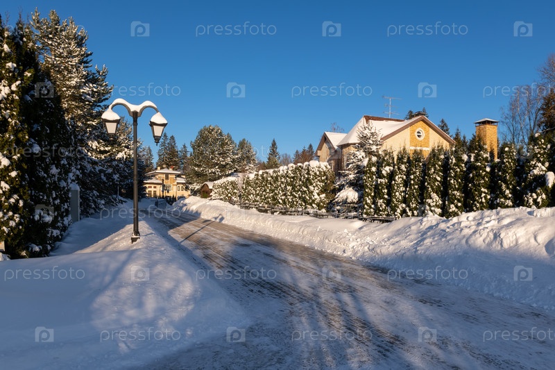Улица коттеджного поселка зимним морозным днем