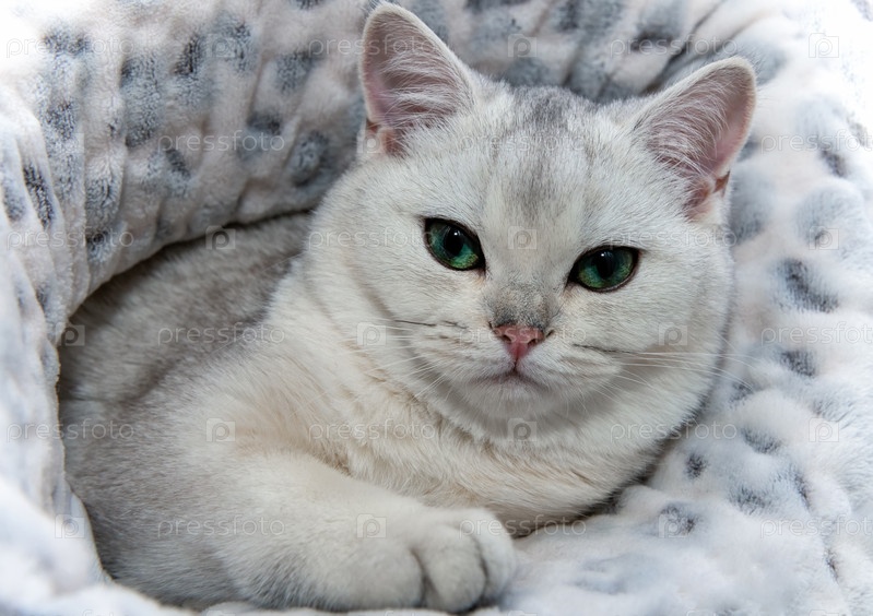 Кошка породы Британская кошка шиншилла в одеяле грустно смотрит на зрителя